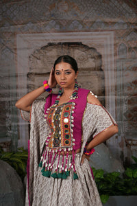 Tribal mirror work adjustable cape top with flared printed lehenga