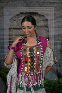 This printed lehenga features a vibrant magenta border and is paired with a free-size cape-style top. The top stands out with detailed mirror work, decorative shells, tassels, and colorful thread embroidery, creating a striking ethnic look.
